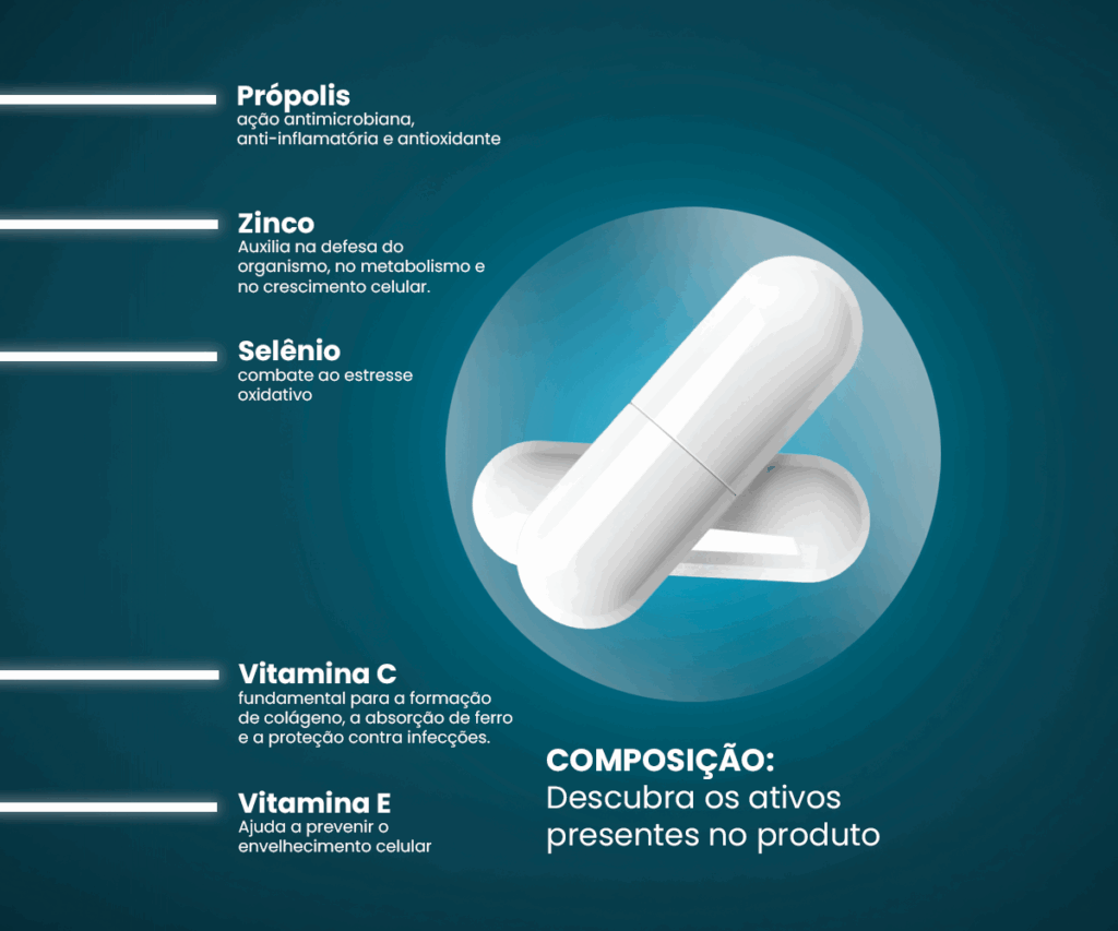 • Reforço do sistema imunológico: A combinação de vitaminas e minerais essenciais fortalece as células de defesa do corpo.