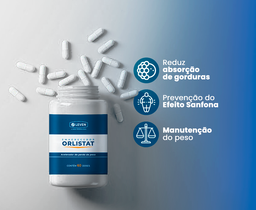 Orlistat Emagrecedor LEVEN é um medicamento que bloqueia a absorção de cerca de 30% da gordura ingerida, facilitando sua eliminação e promovendo a perda de peso.