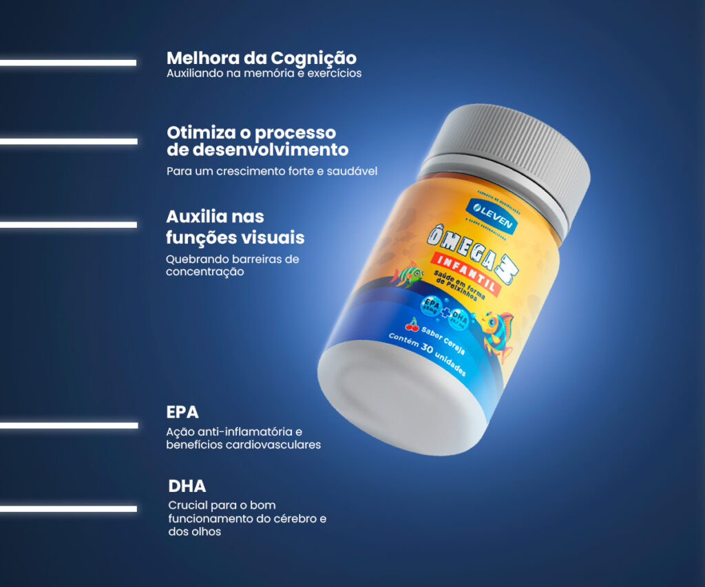 O Ômega 3 Infantil é um suplemento alimentar desenvolvido para auxiliar no desenvolvimento saudável das crianças. Sua fórmula é rica em DHA (ácido docosa-hexaenoico), um tipo de ômega 3 essencial para o desenvolvimento cerebral, cognitivo e visual. O consumo regular ajuda a melhorar a concentração, a memória e a capacidade de aprendizado, além de fortalecer o sistema imunológico dos pequenos.