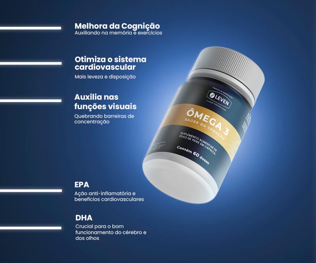Cada dose de 1g do Ômega 3 LEVEN é formulada para garantir a ingestão desses componentes vitais, sendo o EPA reconhecido por sua ação no sistema cardiovascular e o DHA essencial para a saúde do cérebro e dos olhos.